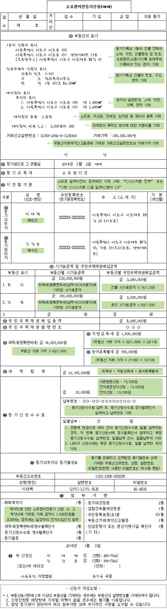 매매에 의한 소유권 이전등기 신청서 작성 예시